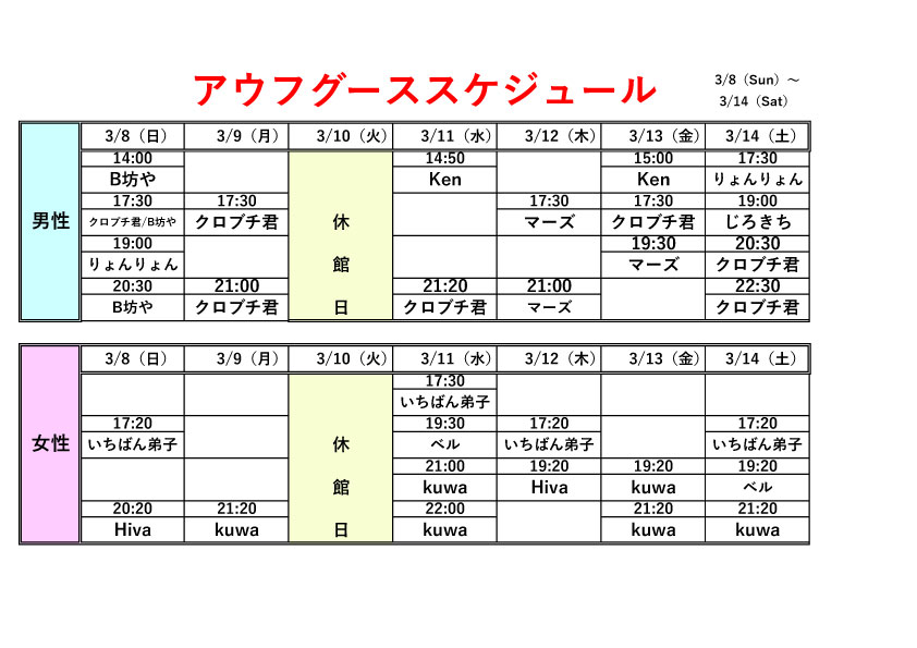 アウフグーススケジュール 3/8~3/14