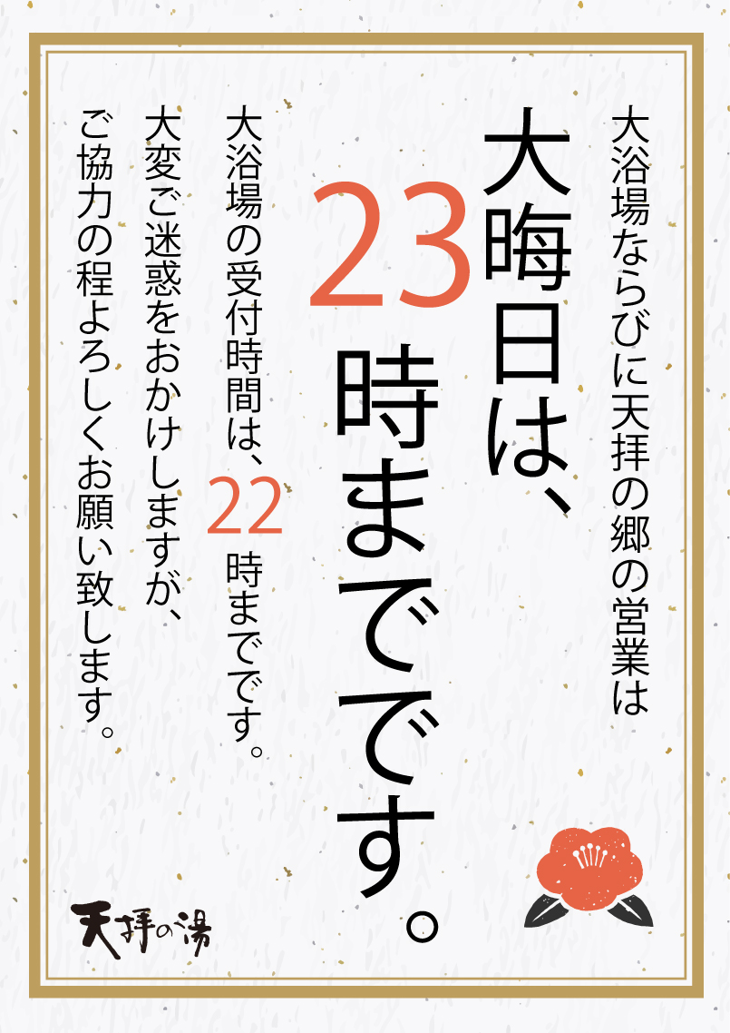 12/31大晦日は、大浴場が通常よりも1時間早い閉店となります。