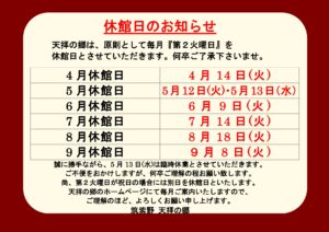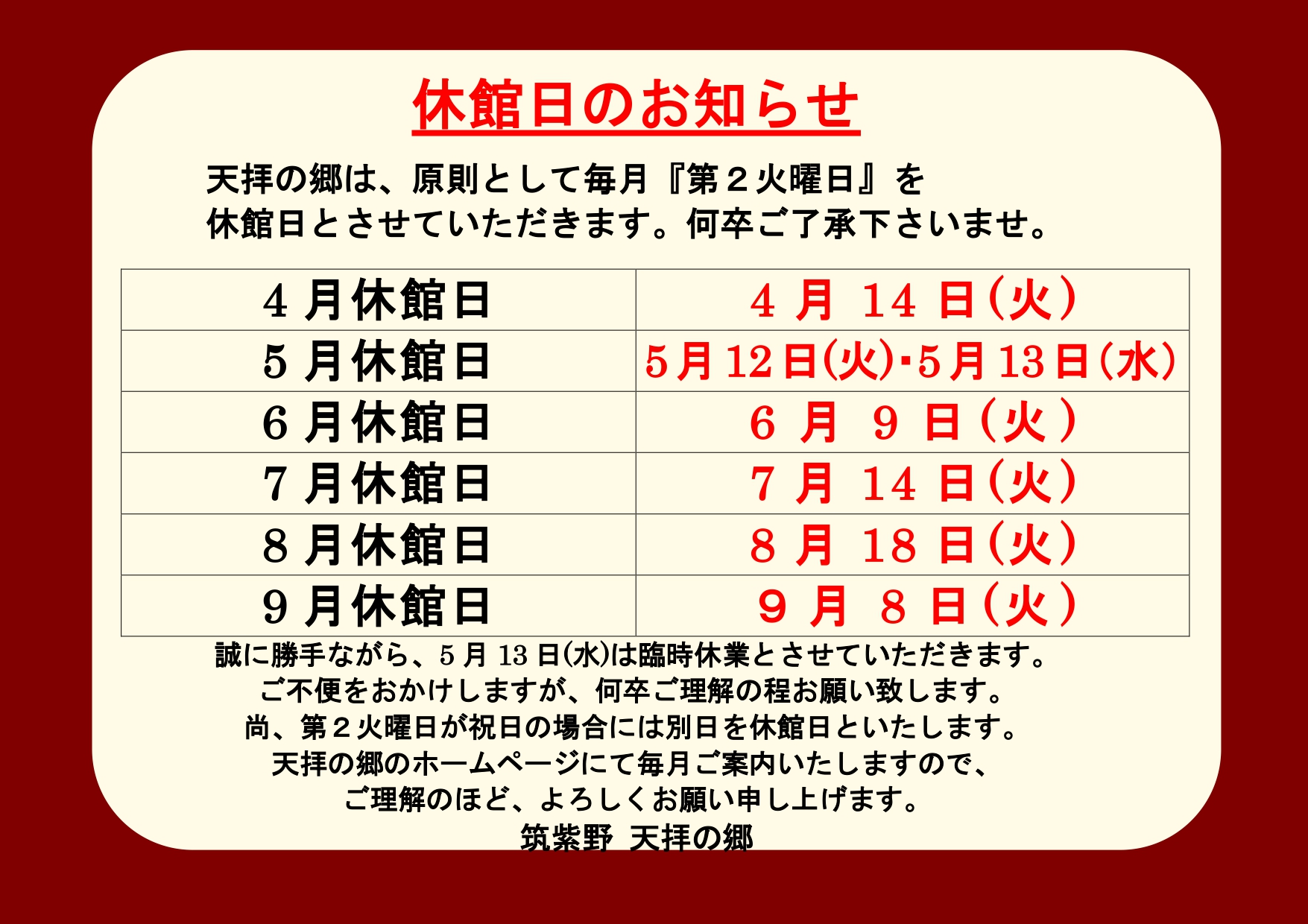 5月の休館日のお知らせ Tweet 平素よりご利用いただき、誠にありがとうございます。 5月休館日のお知らせです。 通常通り5月12日(第2火曜日)は休館日となります。 また、誠に勝手ながら休館日の次の日の5月13日(第2水曜日)臨時休業とさせていただきます。 大浴場男女の入れ替え日は、5月14日(木)に実施予定です。 ご不便をおかけしますが、何卒ご理解の程よろしくお願い申し上げます。